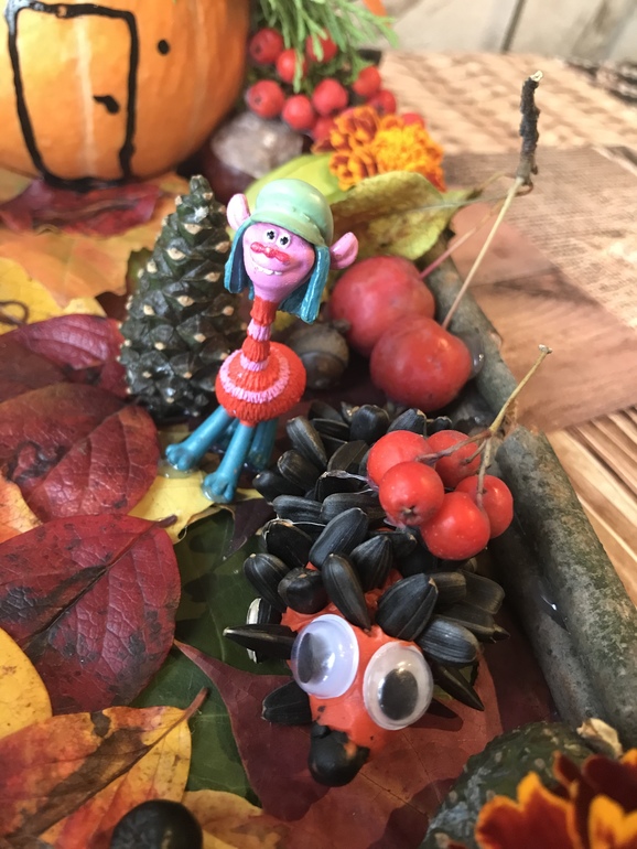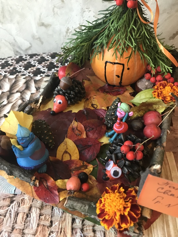 Мы насобирали сухих палочек, листиков разнообразных, цветов, шишек, маленьких яблочек, рябины, черноплодки, даже елочка у нас есть и поселили в наш домик троллей и ежиков. Одного ежика сын полностью делал сам, я только словестно контролировала процесс. Клеили все на горячий пистолет (сын сам, я контролировала как наливать и куда клеить, прижимала все сама, тк горячевато было). Фигурки сын расставлял сам и определял что куда клеить.