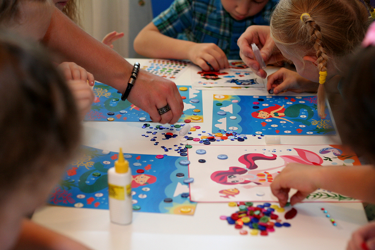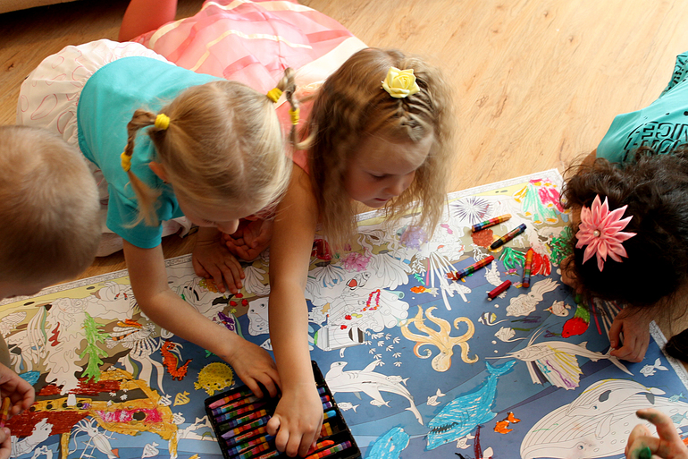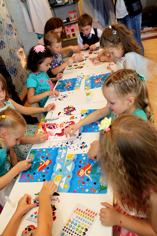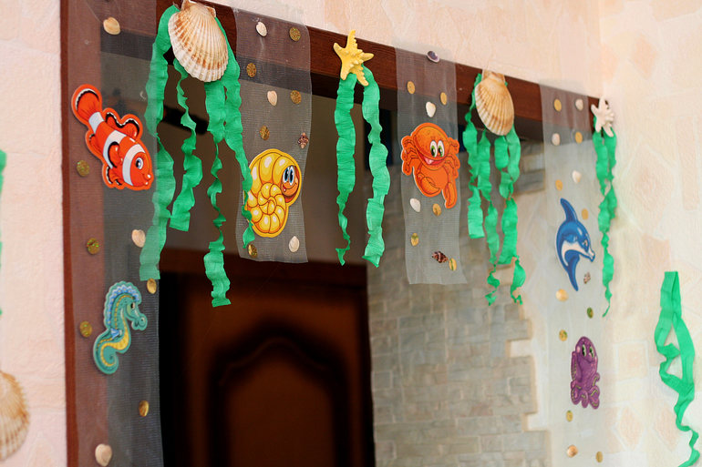 Затем, Тритон поведал о печальном событии. Он шел на др и акулы отобрали сундук с подарками. Предложение - превратиться в маленьких золотых рыбок и отправиться на поиски сундука, было одобрено единогласным "Ура!" Но для начала, нужно было разукрасить подводный мир, чтобы туда попасть.