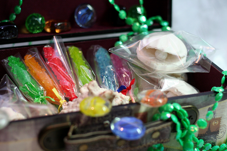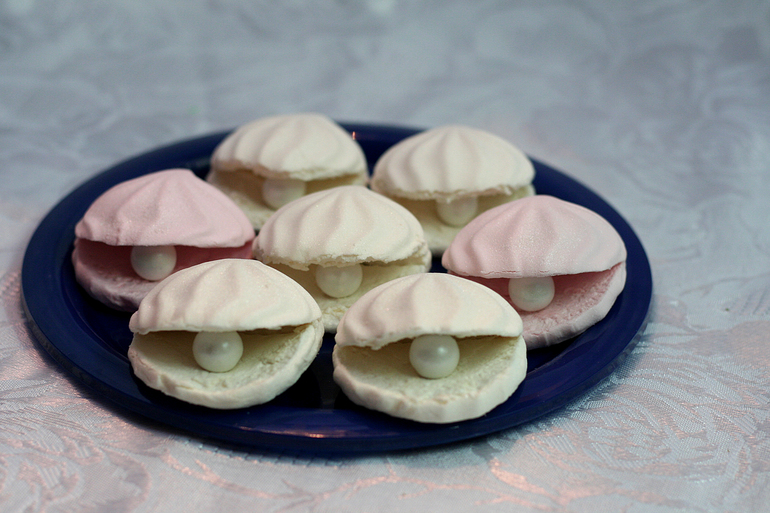 В качестве "драгоценностей" были сахарные кристаллы и раковины с жемчугом (зефир, дражже).