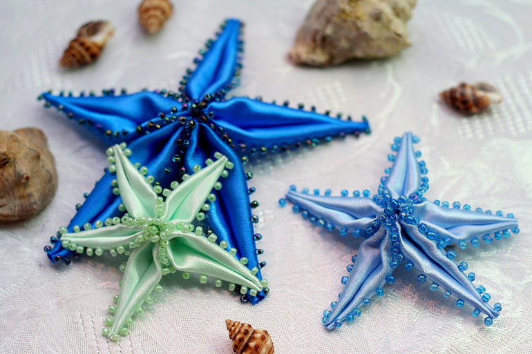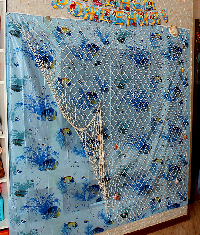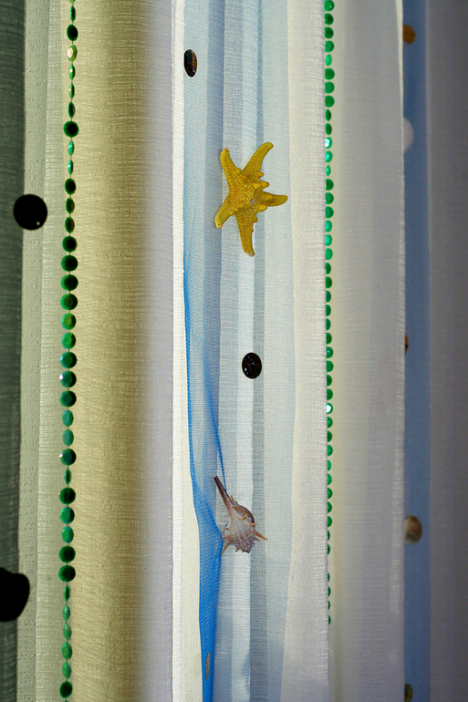 Декор на шторах и входном проеме из настоящих ракушек и морских звезд.