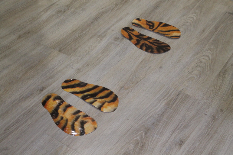 3. По следам тигра. Участвовали пары, каждой раздала картонные следы, надо было преодолеть расстояние, перенося вес на одну ногу, пока другой участник переставляет картонку для следующего шага.