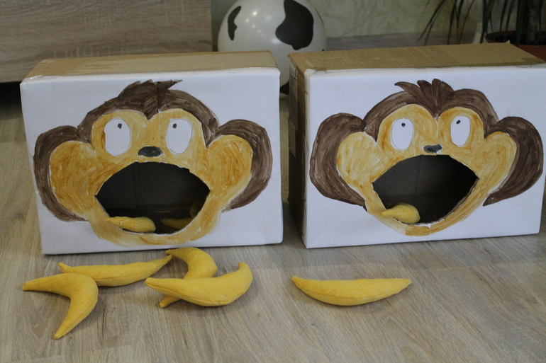 4. Накорми обезьяну. 2 команды по 5 человек, каждому по банану, выигрывает команда, все участники которой быстрее попали.