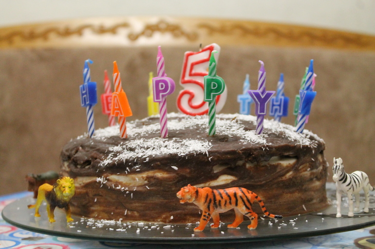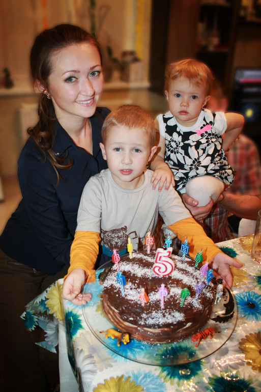 Ну, и конечно, торт!!! Пекла тоже сама, первый раз в жизни))) Получилось вкусно, внутри коржи полосатые (зебра), но мало. В следующий раз на нашу семью надо делать двойную норму)))