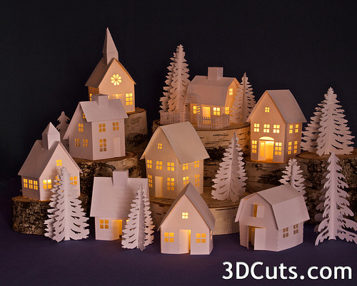 (хочу вырезать такие же деревья как будут в городке, также домики, только плоские и на темно синем фоне наклеить сначала деревья, а потом на объемный скотч деревья , также пальчиками сделать точки - снег и наклеить снежинки)