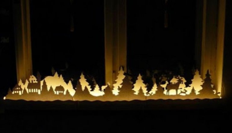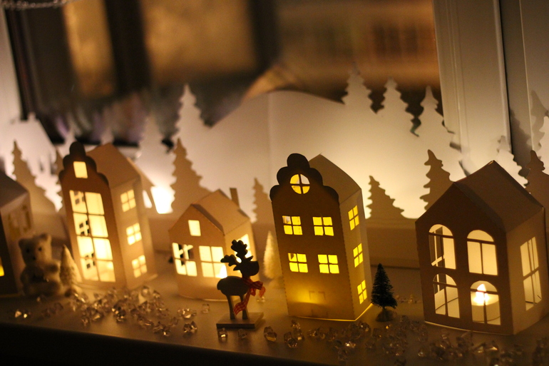 Итак, на подоконнике у меня будет снежный городок: лес из деревьев (пока не нашла шаблоны… поделитесь, если есть) с гирляндой от икеа на батарейках, а также домики бумажные.