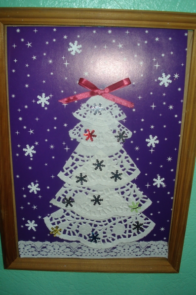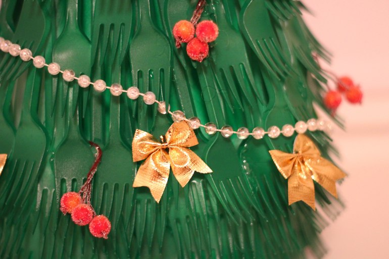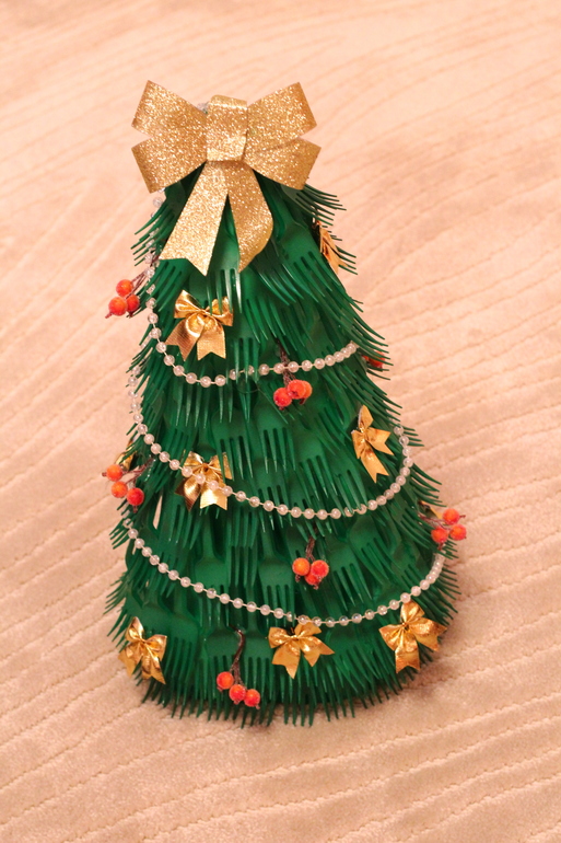 Не могу не показать нашу поделку в школу - ёлочку из вилок, мы взяли около 200 белых вилок, наклеили их на основу-конус из плотной бумаги, затем окрасили из баллончика и украсили. Сами остались жутко довольны :)