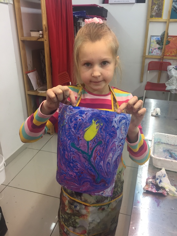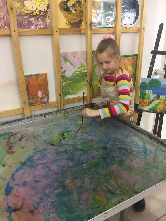 Набор для рисования в технике эбру или сходите на мастер-класс по эбру. Это супер!!! Как вариант еще световой планшет Рисуй светом. Про полимерную глину вам еще хорошо советуют. Мы правда сначала на мастер класс ходили, потом уже закупали, что нужно.