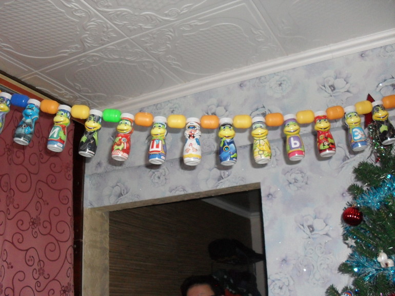 Вот такую гирлянду я сделала из бутылочек Растишек и Актимеля и капсул от киндеров. И это только одна, в процессе еще одна. Как вам?