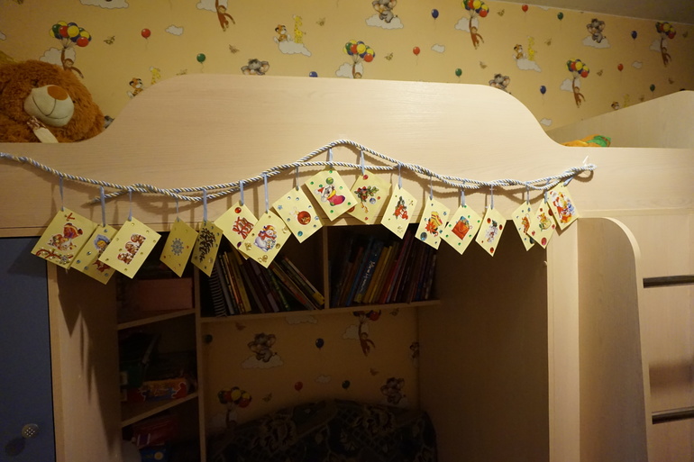 Новый ГодВ этом году первый раз решила сделать для старшей дочери адвент-календарь. Для начала сильно не заморачивалась. Взяла маленькие конвертики, украсила новогодними наклейками и стразами, прицепила на декоративный шнур - вот и готово. Дочь довольна, как слоник. Каждое утро открывает конверт, находит новое задание и выполняет его. А на столе ее ждет маленький сюрприз: то шоколадка, то блокнот, то заколки-бантики, то еще какая-нибудь мелочь.