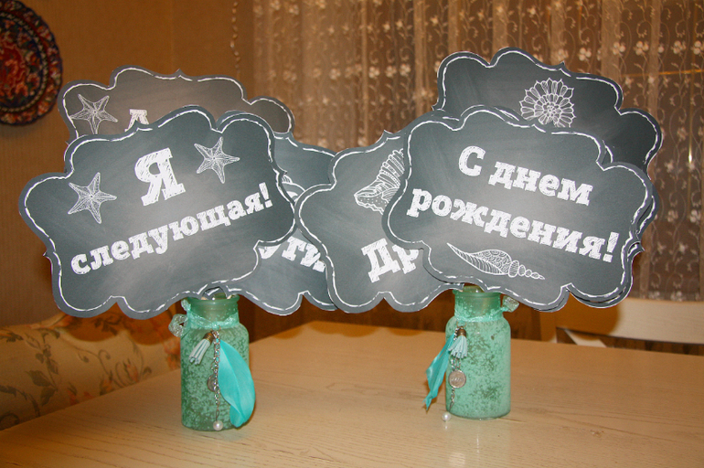 Речевые облачка заказали у дизайнера, распечатали, приклеили на картон и вырезали. Бутылочки тащила летом из Греции по 2 евро))