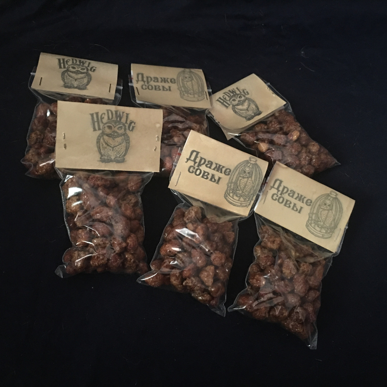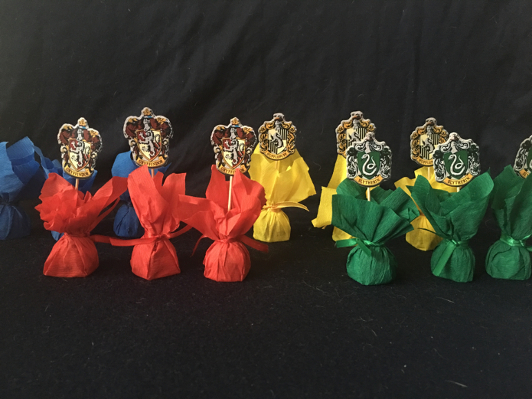 Конфетки сделала по цветам факультета с их гербами на топерах