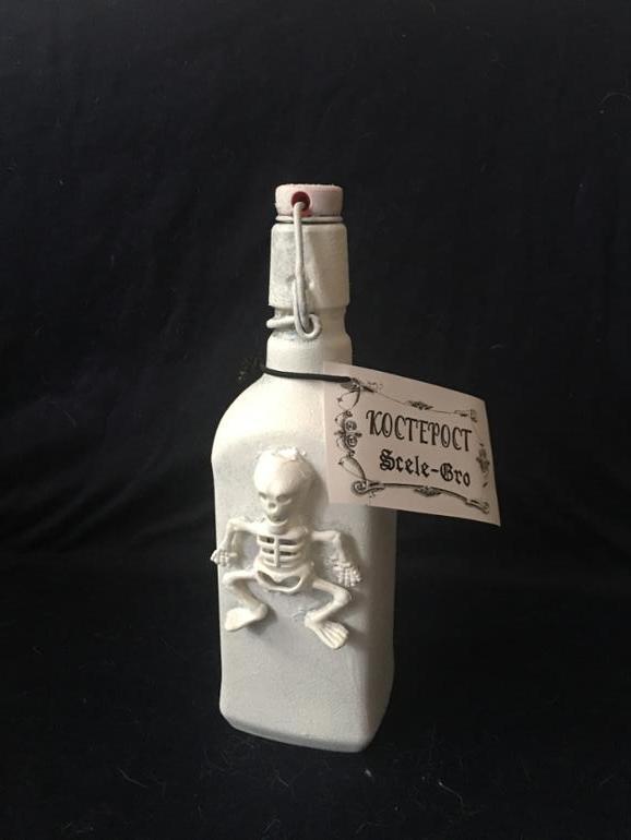 И как же мне самой хотелось сделать бутылку с Костеростом. Думала как то из пластики или папьемаше сделать ребра и череп на пробку... Но так и не собралась так глобально и все упростила: просто половинку скелета от коктельной трубочки приклеила к квадратной бутылке и закрасила все белым