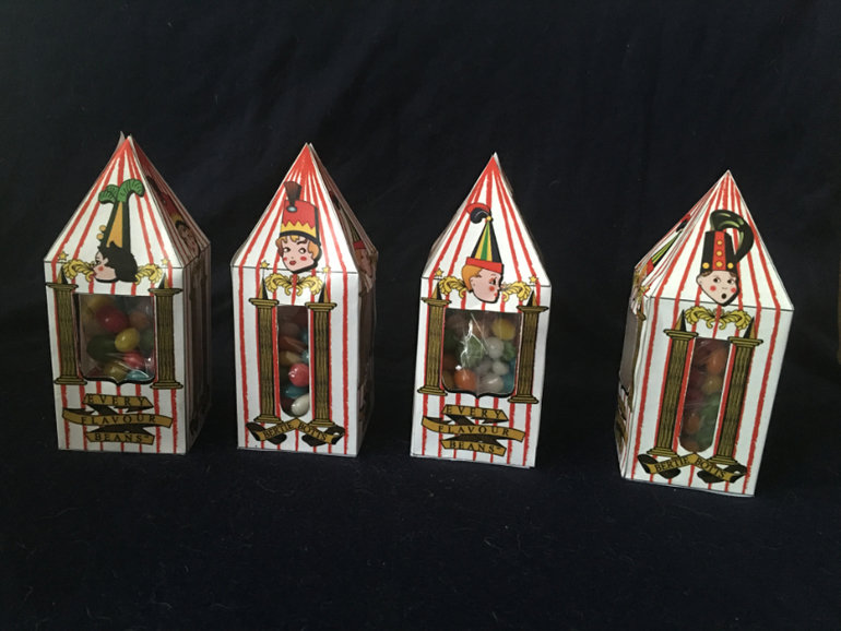 А вот шаблон коробочек под драже Берти Бобс нашла неудачный (в типографию отала первый попавшийся шаблон). В итоге получила очень большие коробки без дна, к которую помещается большой пакет драже (купила морские камушки, они по цвету очень подходят), который очень трудно удержать в тонкой бумажной коробочке... Но перепечатывать в типографии жалко уже...