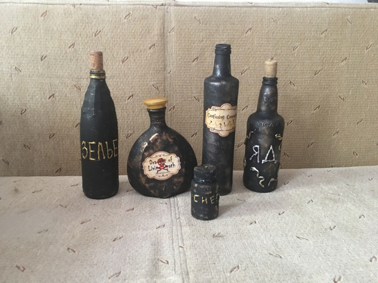 Бутылки с зельями решла украсить в другом стиле, чем было в прошлый раз. Самой этот вариант больше нравится, но и возни с ним больше