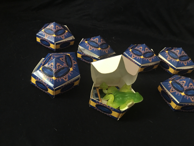 Силиконовый молд лягушки чтобы наделать шоколадных вовремя на али не заказала, а здесь заказать не нашла где, поэтому просто купила больших мармеладных и макет коробочек нашла без надписи Chocolate Frog.