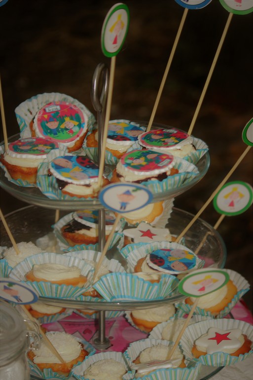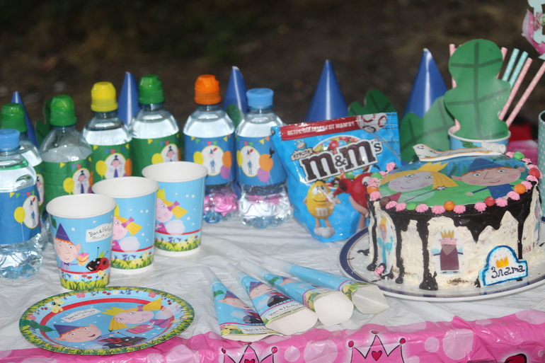 Стаканы, тарелки, дудки,салфетки, трубочки все заказывала с майшопа и ozon. Колпачки Бена вырезала из картона, наклеила наклейки на бутылки с водой ( в виде няня Плам и мудрого эльфа) Капкейки делала сама, как умею))