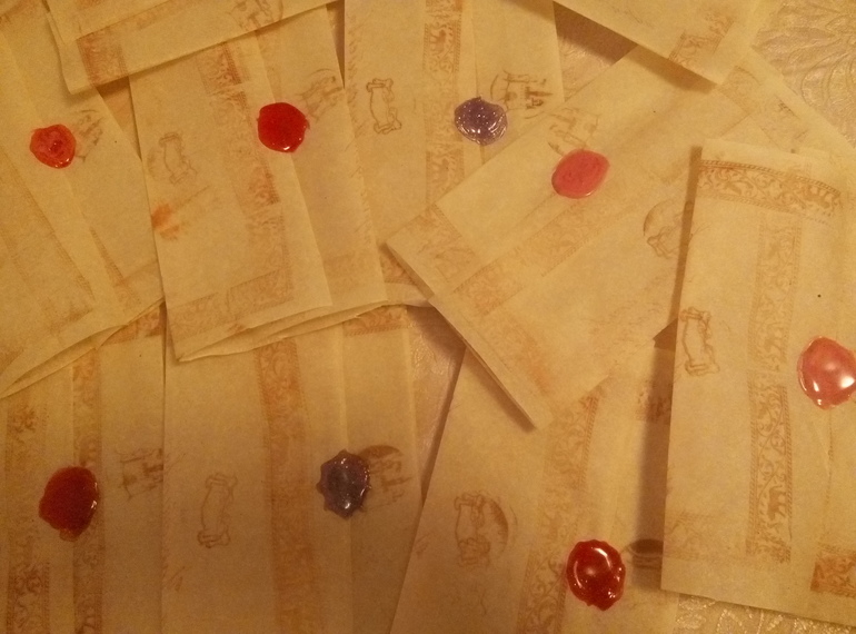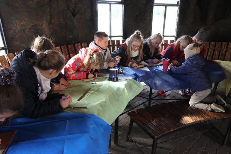 Заклинания и колдовство. На мой взгляд, самая креативная и интересная часть. Детям раздавала свитки ( из бумаги для выпекания), и магические ручки. Потом рассказывала, что то, что придумывают маги, через какое-то время появляется в мире маглов. Ну вроде ковра самолета и самолета. И теперь надо придумать новые вещи, которые должны появиться в мире маглов через сто лет. В общем, дети с удовольствием (и немножко с подсказками) выдумывали кашедоедатель, или магнит для арбузных косточек и т.д. Все записали и сложили для отправки в магическую библиотеку.