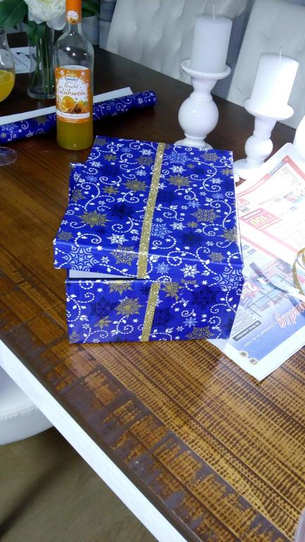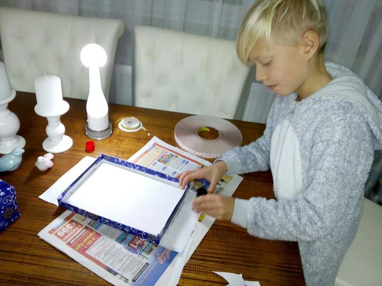 Делали мы всё скорее интуитивно, в первый раз и поэтому дело шло медленно. Сначала обклеили крышку, потом саму коробку. Получилось неплохо, но нам показалось что чего-то не хватает..и мы послали папу на чердак за коробкой с новогодней атрибутукой (бантики, мишура, ленточки) А потом ещё выпросили у него двусторонную клеющую ленту.