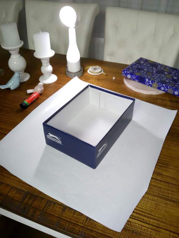 И вот мы уже вытащили пустые обувные коробки, упаковочную бумагу, клей, ножницы...и работа закипела.