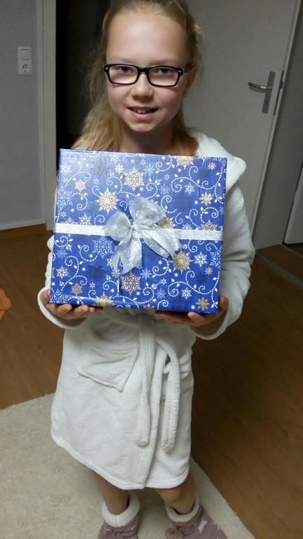 Вот так вот прошло почти два часа...и мы убили сразу несколько зайцев. Во первых ребёнок был занят, а после невероятно счастлив. Во вторых мы сэкономили деньги на всех этих упаковочных подарочных коробках, кои стоят весьма не дешево. И в третьих мы превратили мусор в отличную вещь. Мария сидела и смотрела на наши занятия, а потом cxодила притащила ещё одну коробку и сделала для своего подарка тоже коробочку))