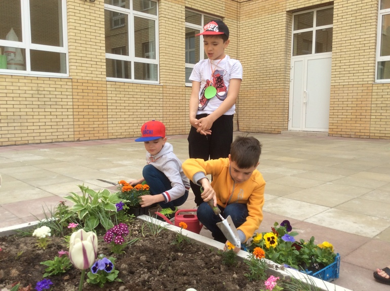 Дети желание загадали и посадили цветы. Девочки сажали анютины глазки на клумбу, а мальчики бархатцы.