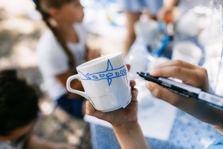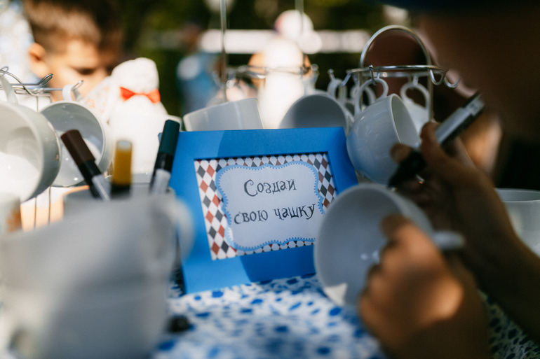 И чаепитие началось. А какое же чаепитие без чашек? Их нужно было сделать самостоятельно (и забрать с собой, конечно). Куча простых белых чашек разной формы, маркеры по керамике и понеслось творчество!