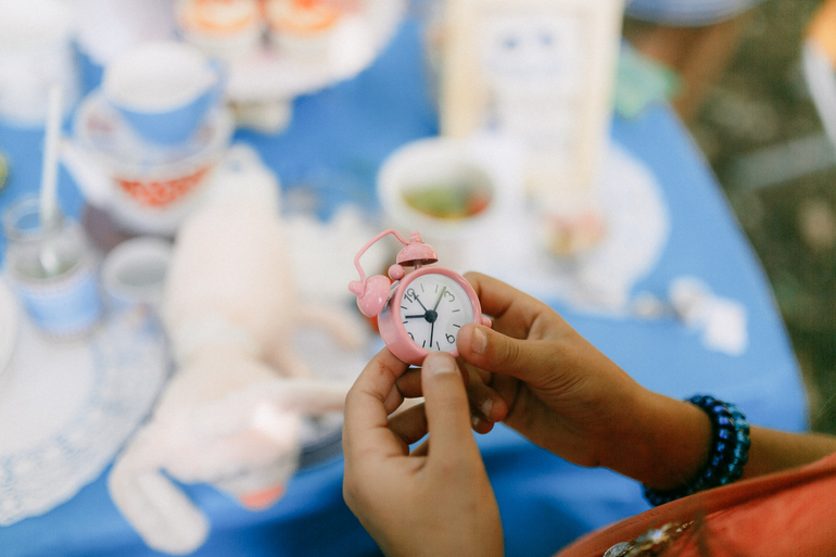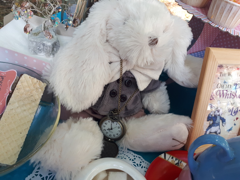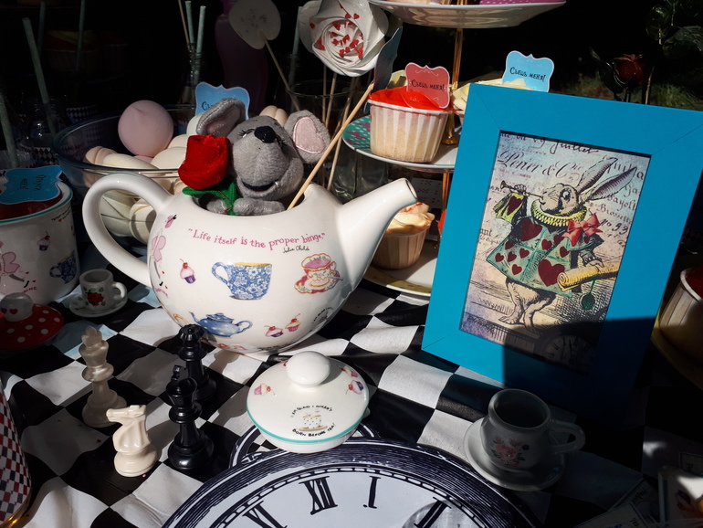 Основные темы: чай, чайники, чашки, часы, кролики, шахматы, шляпы, карты, ключи, салфетки... в общем, есть где разгуляться)