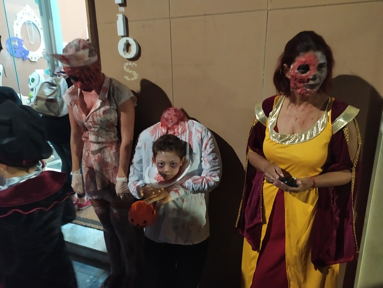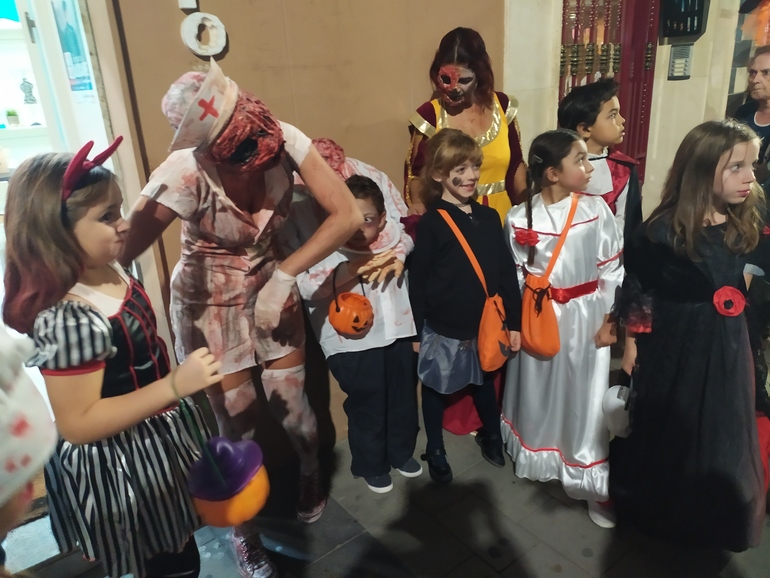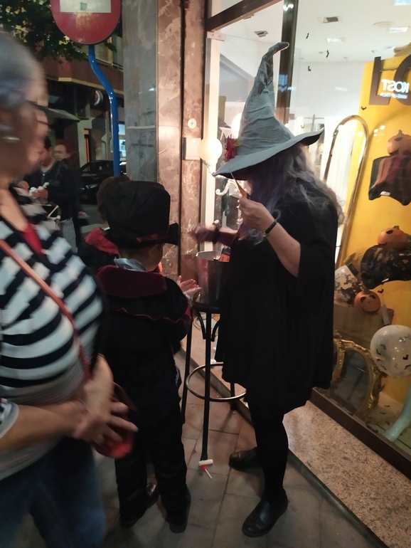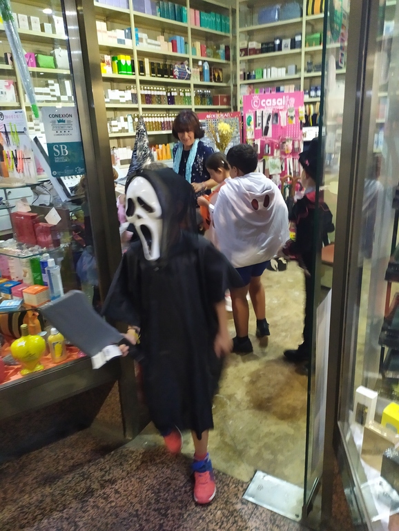 На пороге каждой лавочки стоят продавцы в костюмах и раздают сладости всем желающим. Для сбора конфет дети носят с собой пластиковые тыквы.