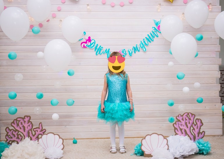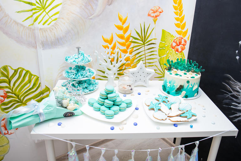Праздник проходил в игровой. На фото наша фотозона - долго искала идеи, и мне очень понравился итог - шарики в виде пузырьков в воде, кораллы и ракушки на картоне (это я заказала), помпоны внизу, растяжку морскую нашла на Вайлдберриз случайно и небольшие розовые элементы - розовая гирлянда из кружочков…