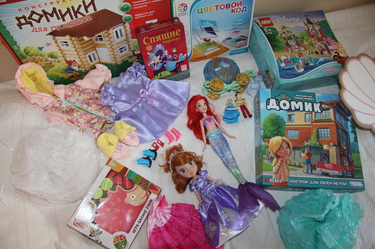 Еще покажу что подарили нам на 5 лет, все подарки выбирала я сама: кукла Русалочка Дисней, кукла Принцесса София, настольные игры Домик, Спящие королевы, Цветовой код, балансир ёжик, лего, одежда куклам, конструктор домики, набор Золушка (карета, лошадь, принц, Золушка).