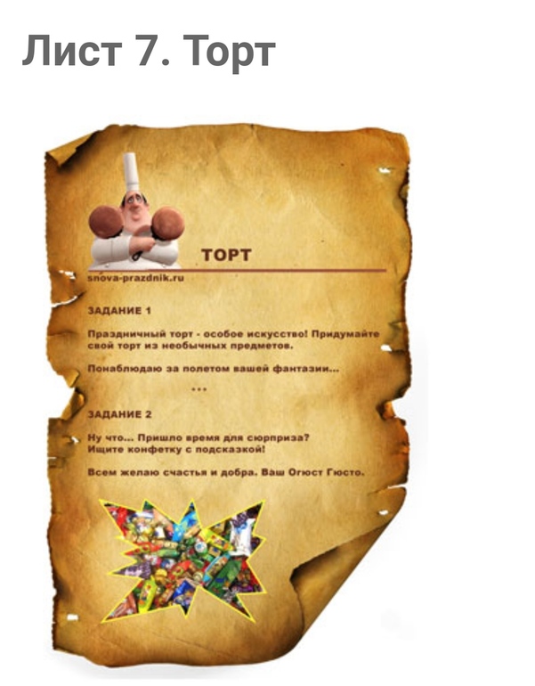 Дети изобретали торты из шариков, ботинок и игрушек, а потом разворачивали конфеты в поисках последней подсказки. У меня это была микроволновка, там в пакете дети нашли три киндер-сюрприза) это все.