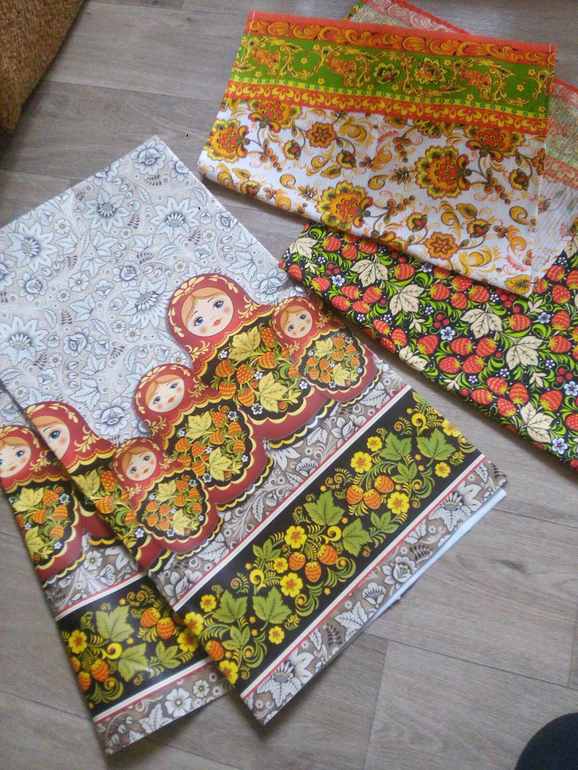 а ещё перед самой Масленицей, несколько дней назад нам пришла посылка от моей интернет-подружки с вот такими тёплыми подарочками к празднику- очень красивые полотенечки и клеёнка на стол.