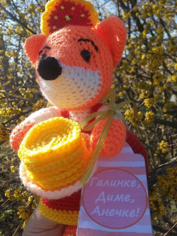 и тоже заняли первое место и выиграли приз-вязанную лисичку с блинчиками...