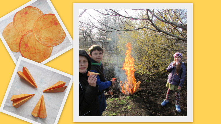 Причём запускаем в него ещё самолётики желаний. Самолётики делаем из распечатанных блинчиков, и пишем на них наши желания, и бросаем в костёр!