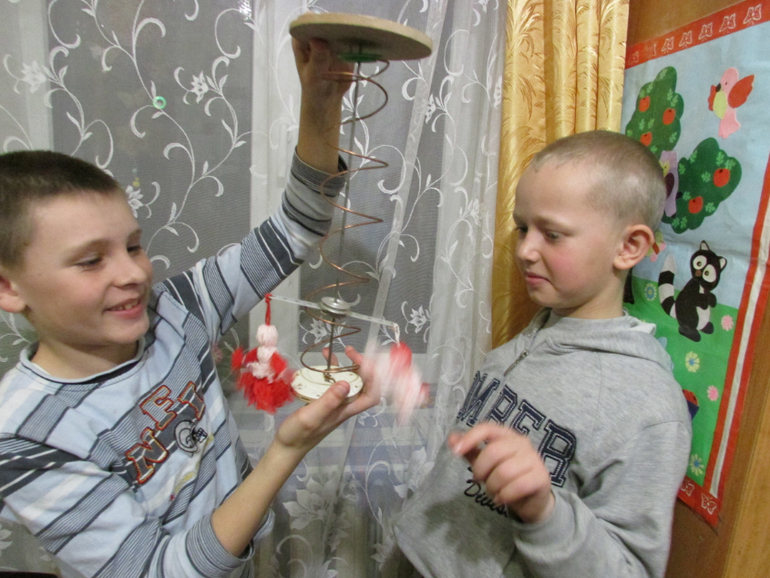 Украшают карусельку сделанные детьми куколки из ниток-Мартинички