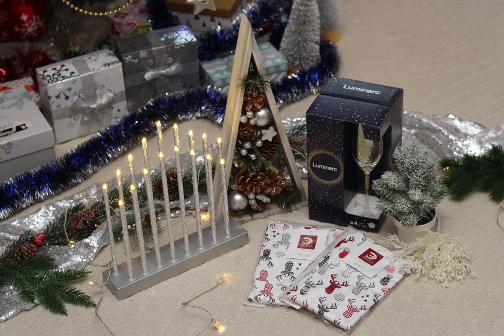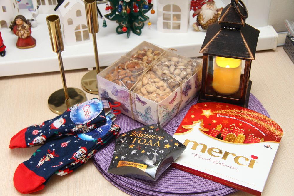 внутри небольшие подарочки для дома: подсвечники, носочки, фонарь...