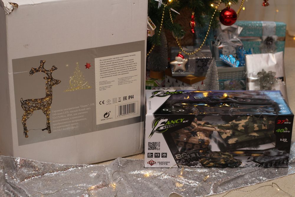 Следом на очереди наши друзья и у них 2 мальчика, им новогодний олень и танковый бой