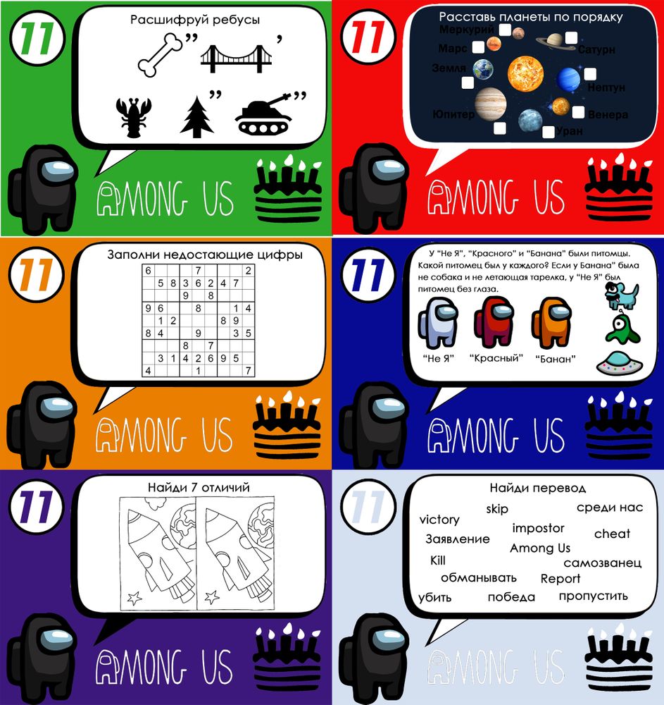 Играли мы таким образом - хочешь открыть пакетик и проверить человечка - не предатель ли он - реши задание, хочешь проверить синего-реши синее задание, хочешь проверить зеленого-реши зеленое задание. Вот такие задания у меня были: