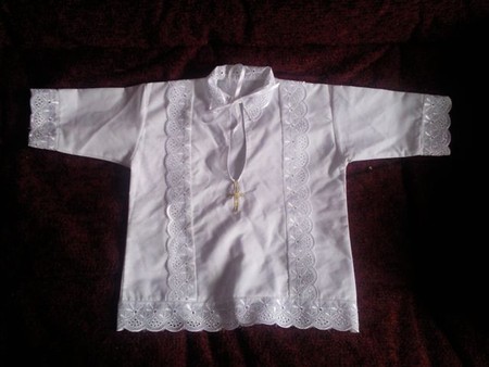 Купила обалденную рубашечку всю в кружевах и с большим вырезом для сына и поехали в храм. Было довольно тепло, т.к. Егор сидел в тоненькой рубашке, в носках и памперсе. Всю процедуру выдержал достойно, сидя у крёстного на коленях, теребя завязочки. Возмущений не было даже тогда, когда батюшка понёс за алтарь. Вообщем я осталась довольна.