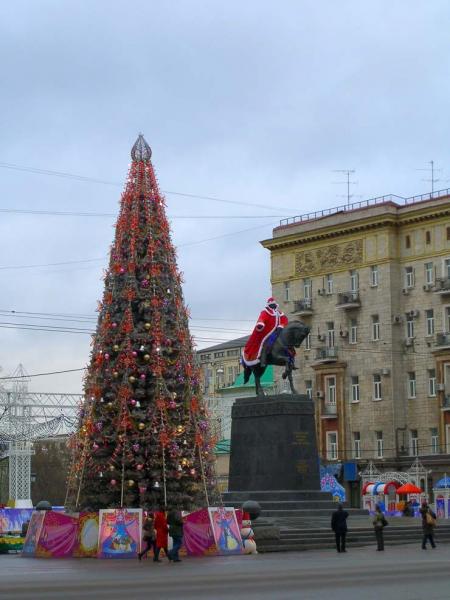 Ёлка у памятника Жукову, её в этот момент только закончили наряжать, она еще без огонёчков
