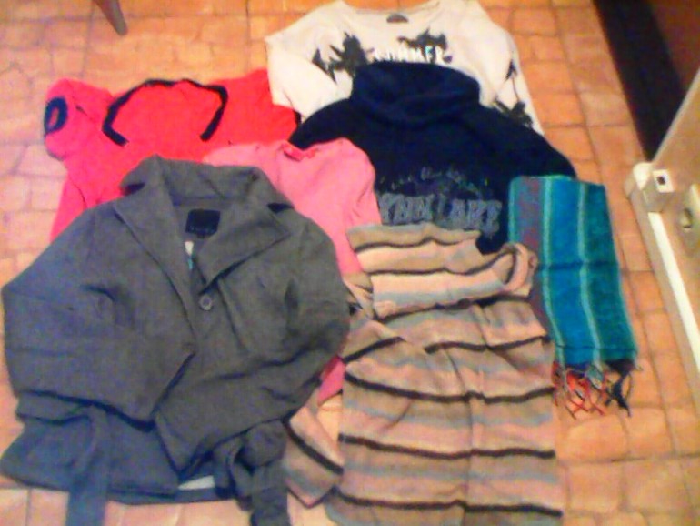 Рюкзак, 3 рубашки, 3 пары брюк (носили в школу), 3 футболки, 1 лонг, 1 спорт. костюм. Состояние разное, но в основном приличное.