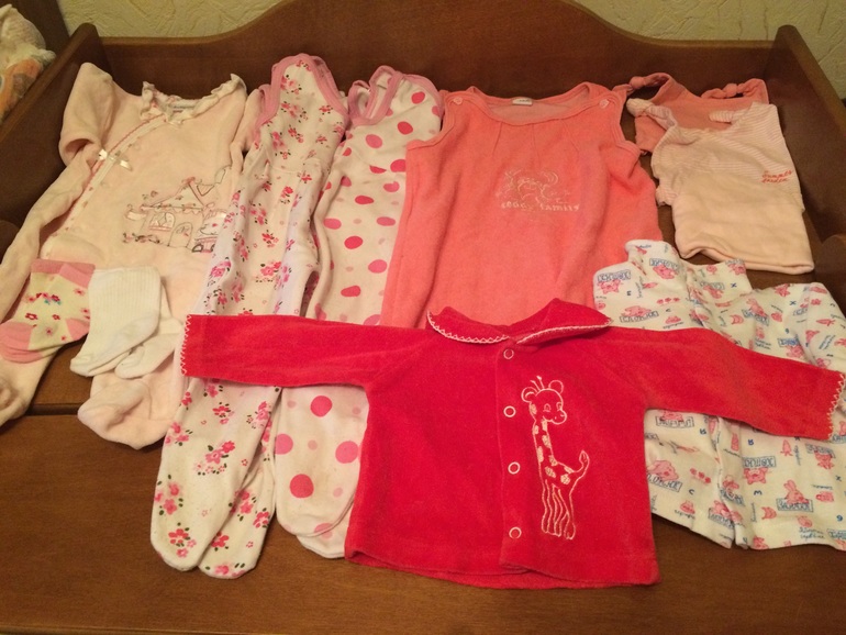 2 пары ползунков, 2 пары носочков, 3 х/б шапочки , 1 спальный мешок, 1 кофточка, 1 праздничный велюровый комбинезончик, 1 праздничная велюровая кофта. Могу поменять на детские пюре и соки.
