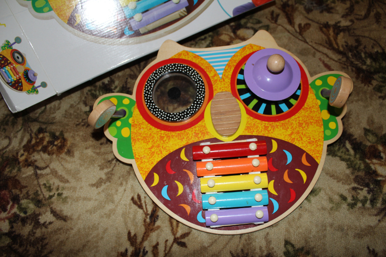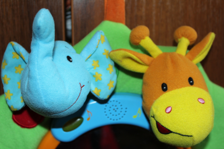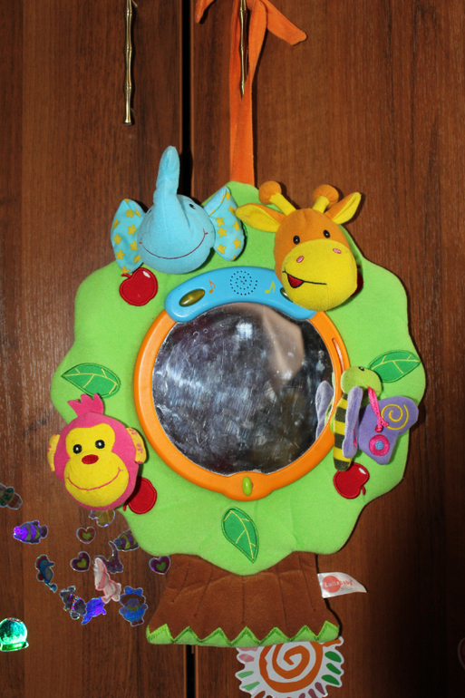 Игрушка подвесная в кроватку. Музыка играет, но тихо, 2 мелодии, при ударе в центр (ручкой, ножкой) издаёт звуки, игрушки снимаются и можно надевать на палец. Из нюансов чуть поцарапана зеркальная поверхность (конечно же она из пластика), на фото заляпанность)), основание (ствол дерева) при нажатии пищит. Экв.700 руб