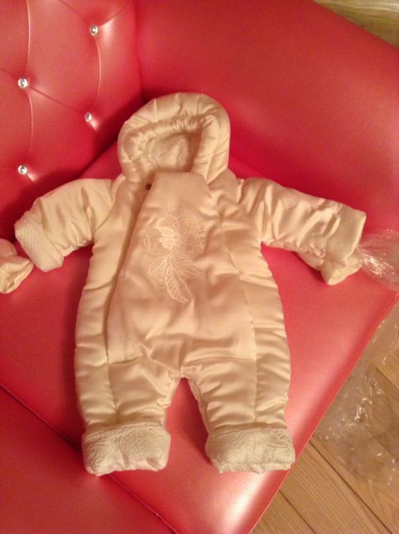 Мы носили конверт с 1 месяца до 5 месяцев. Комбенезон новый. Очень красивый, нарядный и удобный! Фото дома темноваты. В жизни как на первом фото.