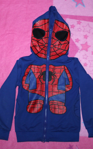 Кофта "Человек-паук", немного испорчен рисунок на капюшоне (видно на фото), в носке не заметно, капюшон на голове ребенка не застегивается, узкий, 3-5 лет, 250 руб