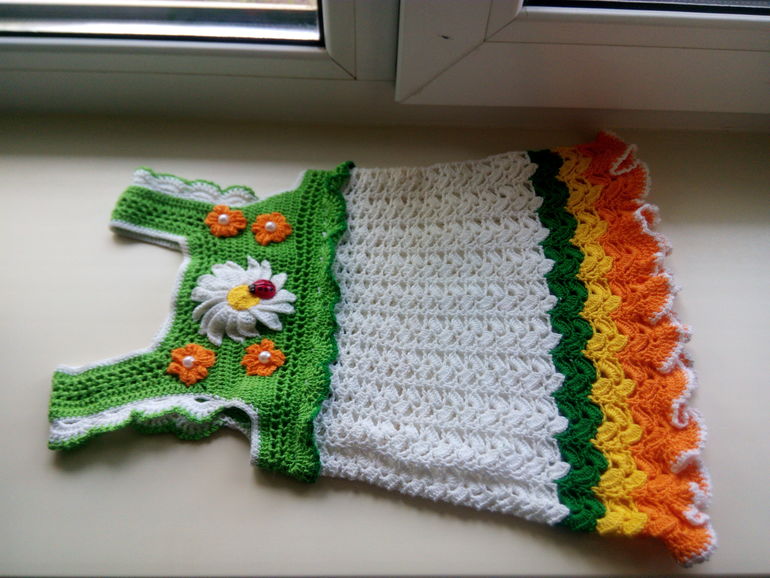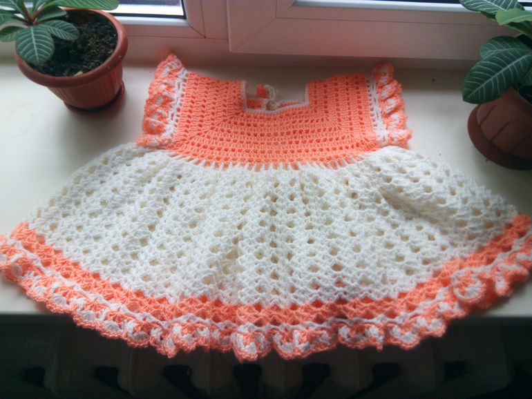 продам детские вещи.СЮДА ПИСАТЬ НЕЛЬЗЯ!!!!Платья в наличии и готовы для отправки. Персиковое платье связано из акрила, можно носить отдельно или с водолазкой. На девочку от 3 месяцев. Его стоимость 200 руб. Платье с ромашками связано из хлопка. На девочку до 80 см. Его стоимость 500 руб.