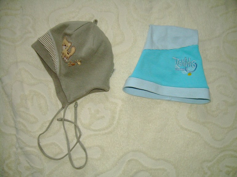 Шапки Хаки с завязками от полугода двойной трикотаж 50руб, синяя шапка от года до 2х лет 50 руб.