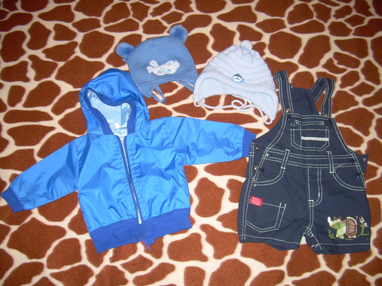 Ветровка с полугода где-то. Комбинезон одели раза 4.Комбинезон коричневый от 8 мес.Жилетки и пинеток нет.Комбинезон оранжевый с 8 мес.где -то,в животном пищалка вставлена.Всё по 150 руб. Шапок нет.
