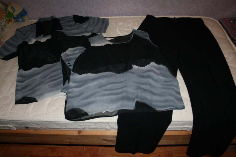 Можно считать тройкой Блузка с топом и черные брюки. 48-50 размер.