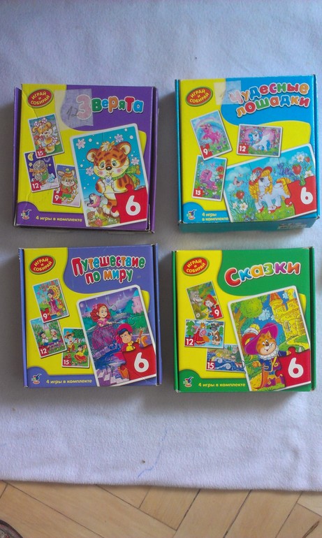 4 Пазлы серии играй и собирай, В коробке по 4 пазла на 6, 9,12 и 15 элементов-всего 5 коробок .Экв. каждой 80 р. Пазлы в идеале, коробки на четверку.